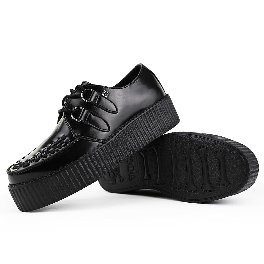 The T.U.K. Viva high sole creeper in premium black leather. The Viva sole is made using a unique lightweight formula so wearing your favourite high sole creepers is not a heavy mission, great for maintaining your stage presence.