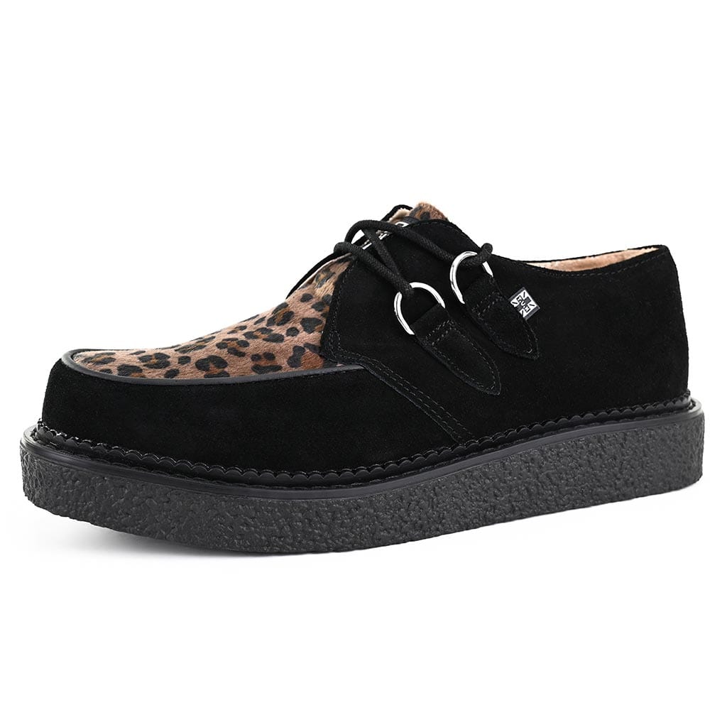 T.U.K.'s premium creeper in black suede with a leopard print vamp. These round-toe creepers feature a natural rubber sole with crepe finish and stitched welt detail. They feature leather lining with removable memory foam insoles for extra comfort. The sole height stands at approximately 3.5cm at the heel and 2cm at the toe.