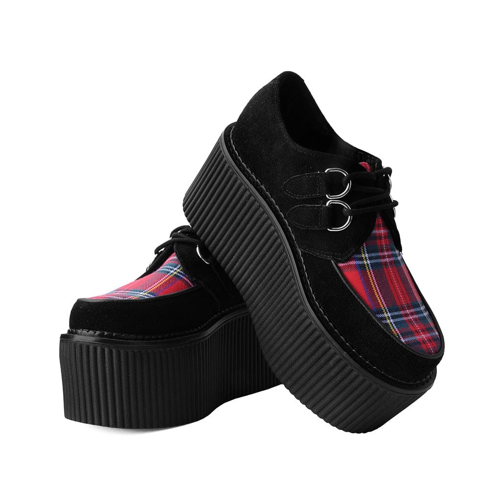 Stand tall and stand out with our StratoCreeper in black suede and tartan canvas. Featuring a lightweight 7.5cm sole with our iconic T.U.K skull & bones tread. Includes plush memory foam insoles and zipper closures for easy on & off—the perfect creeper for added height with maximum comfort.