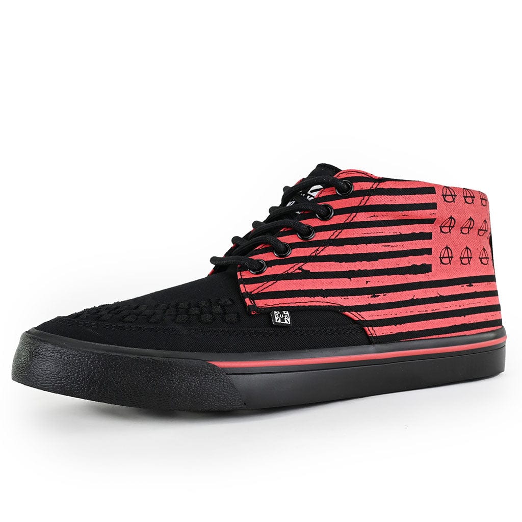 Our Mid Top Creeper Sneaker in black canvas with red anarchy print is the ultimate T.U.K staple. Featuring memory foam insoles these versatile creepers have been constructed for everyday wear and durability. Wear it on its own for the perfect everyday sneaker or style with your favourite T.U.K accessories.Â