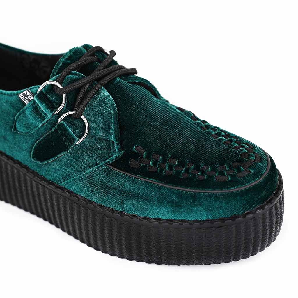 The T.U.K. Viva high sole creeper in emerald green vegan velvet. The Viva sole is made using a unique lightweight formula so wearing your favourite high sole creepers is not a heavy mission, great for maintaining your stage presence.